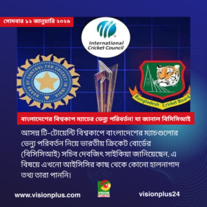 আসন্ন টি-টোয়েন্টি বিশ্বকাপে বাংলাদেশের ম্যাচগুলোর ভেন্যু পরিবর্তন নিয়ে ভারতীয় ক্রিকেট বোর্ডের (বিসিসিআই) সচিব দেবজিৎ সাইকিয়া জানিয়েছেন, এ বিষয়ে এখনো আইসিসির কাছ থেকে কোনো হালনাগাদ তথ্য তারা পাননি। তাঁর ভাষায়, ভেন্যু পরিবর্তনের বিষয়টি মূলত ক্রিকেটের সর্বোচ্চ নিয়ন্ত্রক সংস্থা আইসিসি ও বাংলাদেশ ক্রিকেট বোর্ডের (বিসিবি) মধ্যে আলোচনার বিষয়।